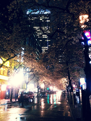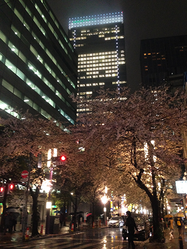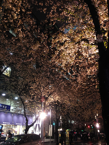 ライトアップされているこちらの桜並木ですが、きっと天気が良かったらもっと撮りやすいうえに綺麗に見えたかもしれない・・・残念。