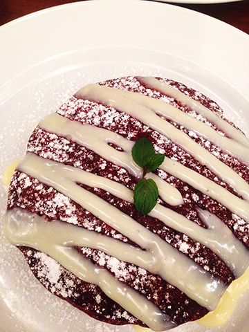 個人的にレッドベルベッド(写真の下)という赤いパンケーキがものすごい気になっていたので頼んだのですが、こちらは実際はチョコレート味のパンケーキでございまして。