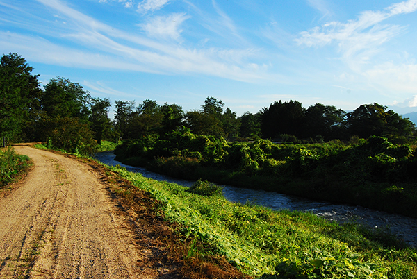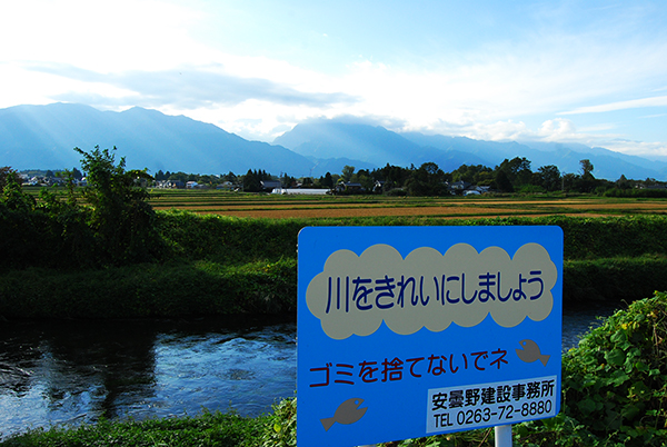 すっかり夕暮れ時間帯となりつつある中でしたが、わさび農場からすぐのせせらぎの小径を通りつつ湧水を汲みに安曇野の里へ向かってみました。