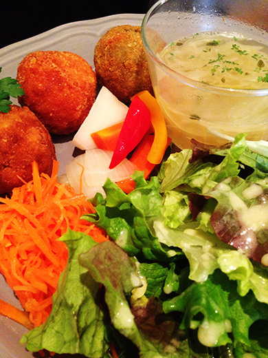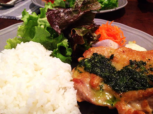 本日のランチなるものを頼んだらば、上のような鶏肉がバジルソースで味付けをされているものが出てまいりまして。