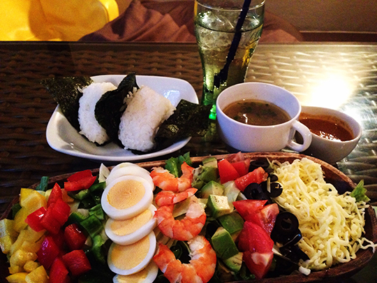今回はぎりぎりランチセットのある時間帯だったのですが、このボリューミーで色とりどりなサラダとおにぎりとスープとドリンクとセットで800円!!