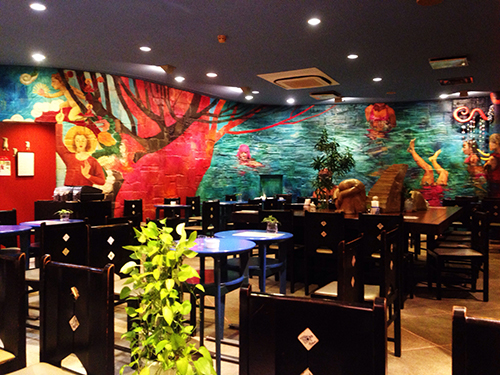 ギャラリーを打ち出しているだけあって、喫茶店では珍しいなかなか奇抜な色使いの店内(笑)