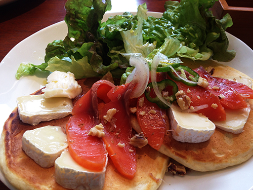 結構な種類のパンケーキメニューで迷いましたが、サーモン&チーズときたらもうそれしか目に入らず。