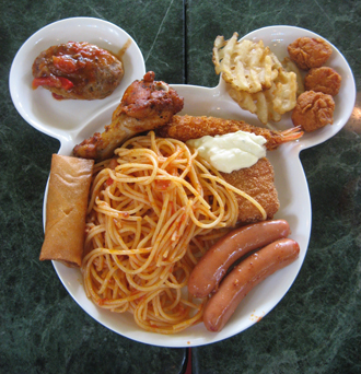 ホテルを出ると雨はほとんど止んでいたので戻って、陸内のビュッフェへ。