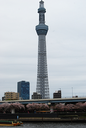 どんより天気でグレーと青が基調のスカイツリーと桜のコラボレーションはやはりイマイチ・・・