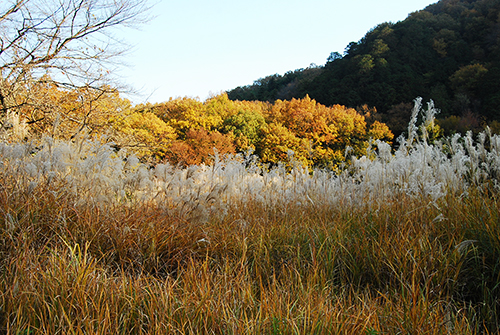 渓谷入口の手前で遠くまで見渡せる紅葉の風景がございまして、ここですでに目が保養。