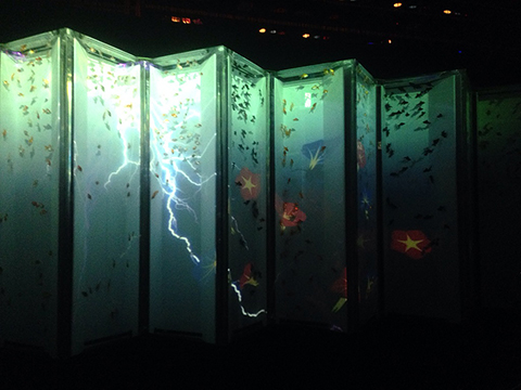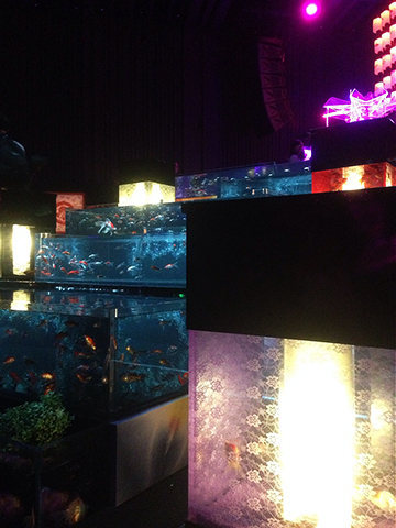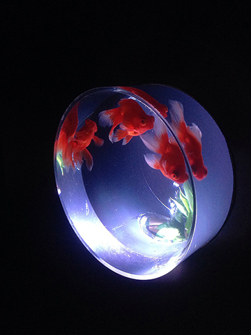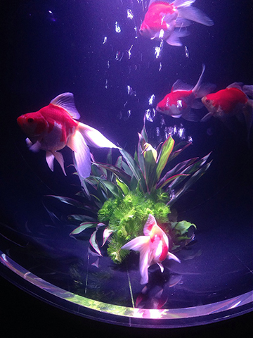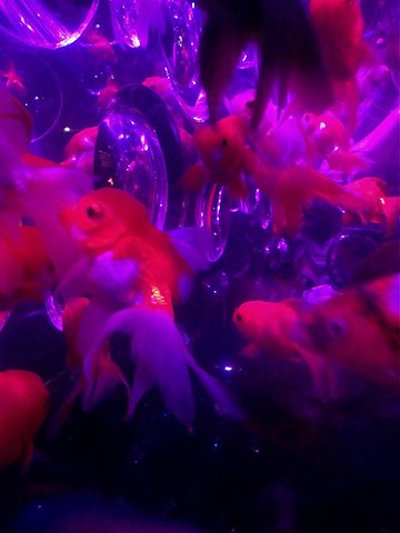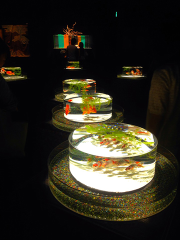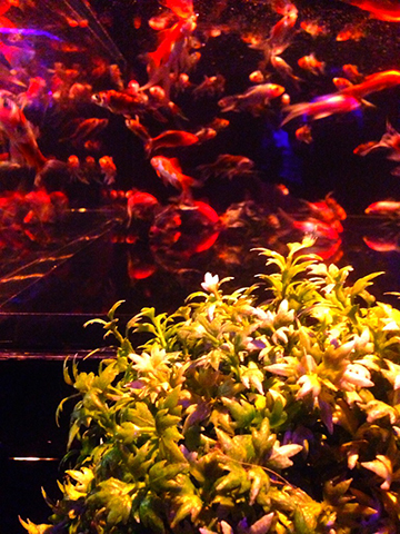 ちなみに見に行くと芸術的&幻想的だと思いつつも、やはり魚としては本望でない光を人間的都合で当てがっているような気がして金魚が可哀そうにも思います。